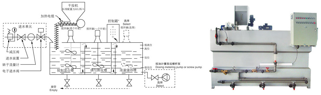 也有分批制備和投加功能的二槽式機(jī)型,或半自動制備系統(tǒng),簡易型溶液藥裝置。